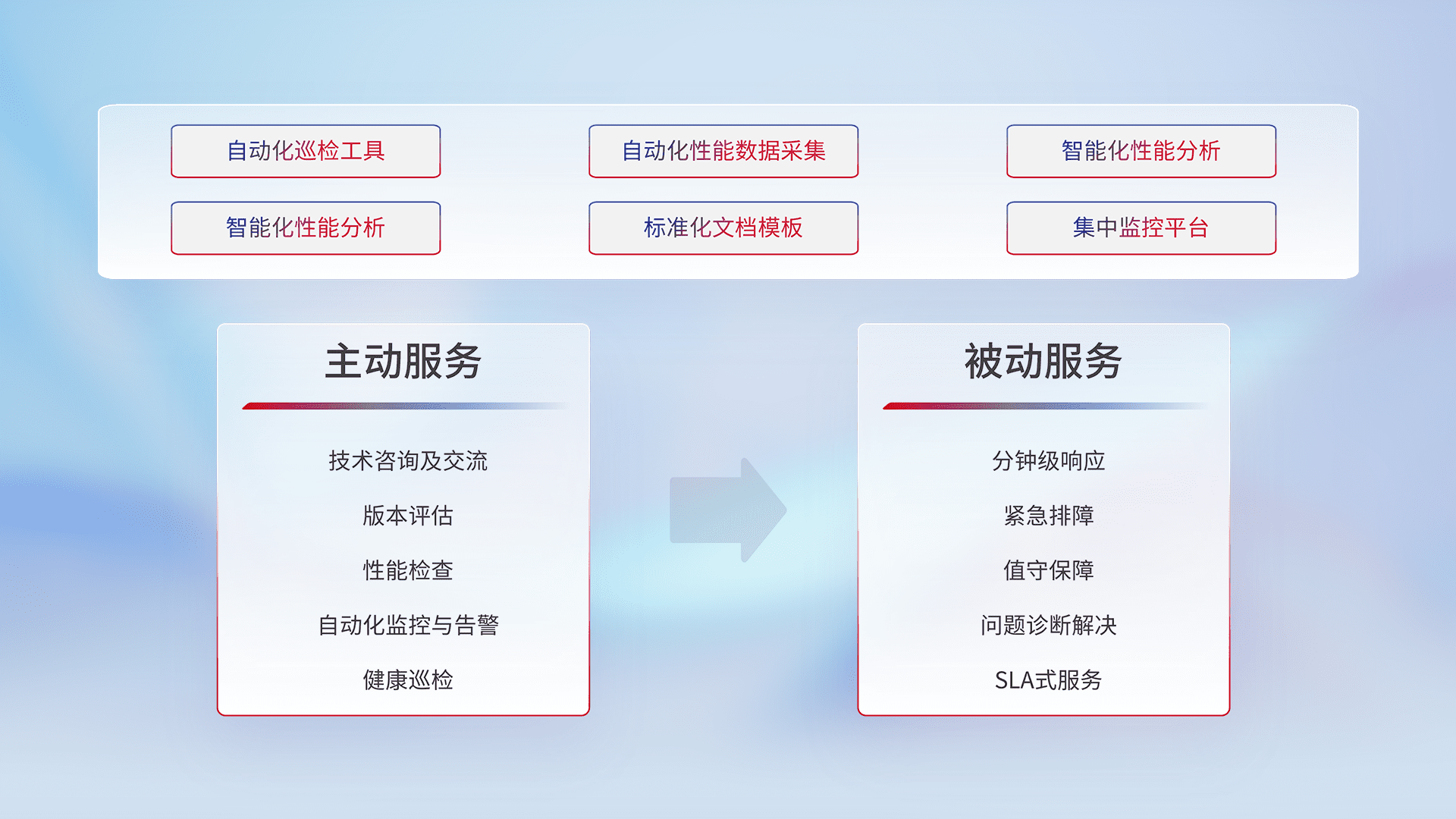 智能化工具和标准化文档,,保障服务质量,,提供主动服务(包含技术咨询、、版本评估、、、、性能检查、、、、自动化监控与告警、、、健康巡检)和被动服务包含(分钟级响应、、、紧急排障、、、值守保障、、问题诊断解决、、、、SLA服务)。。